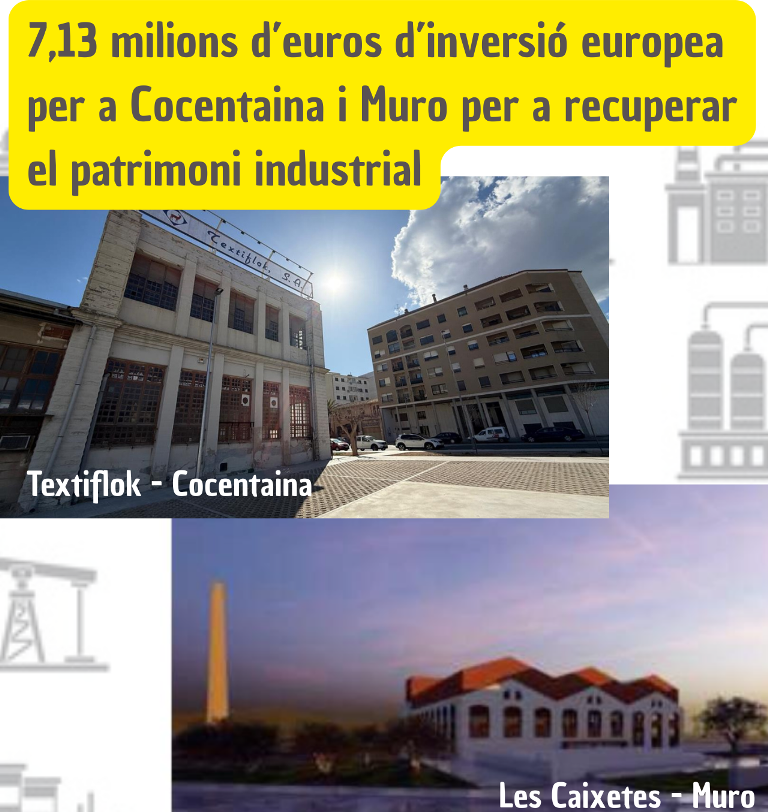 Muro i Cocentaina mobilitzen una inversió pública estimada en 7,13 milions d’euros vinculada a fons europeus FEDER per a impulsar un pla d’actuació integral de la mà del Ministeri d’Hiseanda. D’eixa xifra, 4,28 milions d’euros corresponen a l’ajuda europea (60% del total) i la resta és cofinançament municipal, amb una aportació conjunta aproximada de 2,85 milions d’euros entre ambdós consistoris.