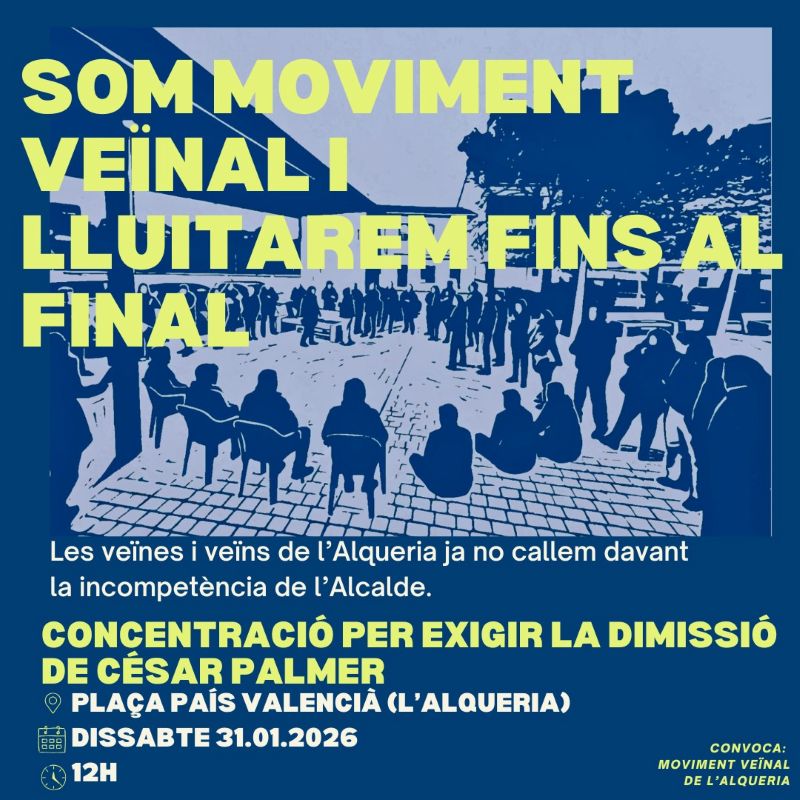 Els veïns d’Alqueria mantenen les concentracions en la plaça del País Valencià els dimecres a la vesprada, i ara han convocat per a este dissabte 31 de gener, a tot el poble i veïns de la comarca que vulguen adherir-se a un acte de protesta, a partir de les 12.00H, en la mateixa plaça del País Valencià.
